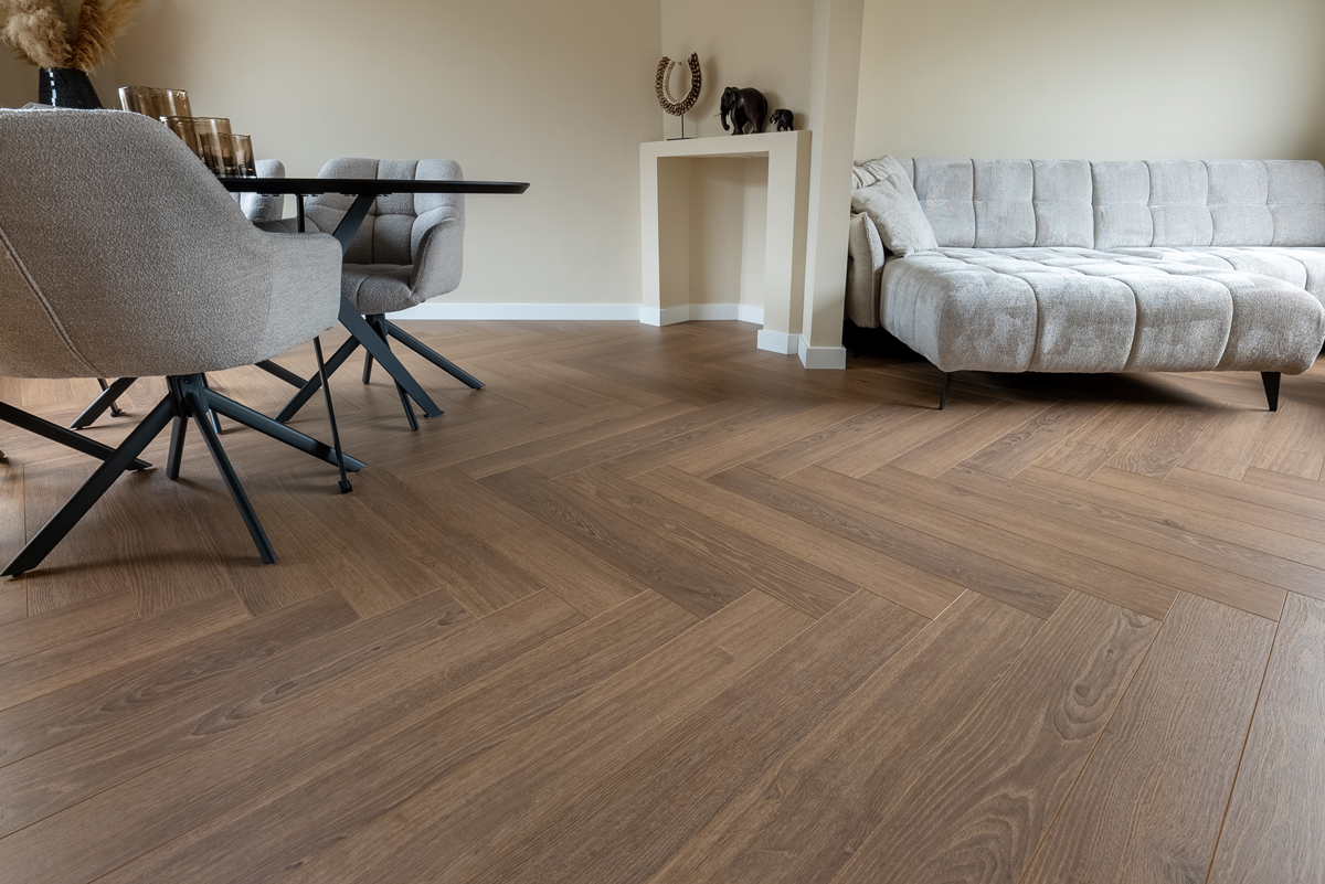 Een klassiek visgraatpatroon met moderne performance: waterbestendig, krasvast en eenvoudig te leggen. Perfect voor een luxe, elegante uitstraling.